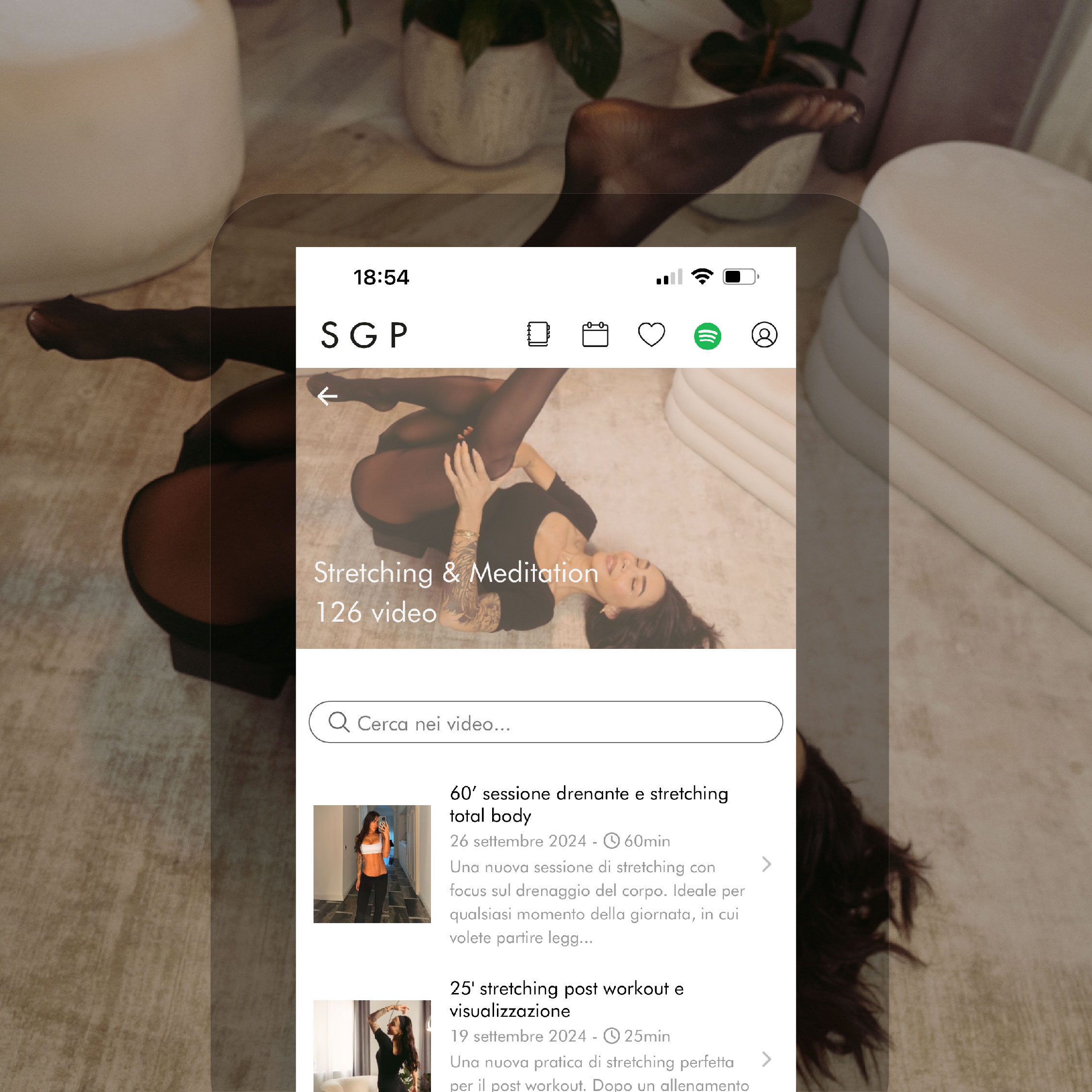 In questa sezione potrai programmare le tue sessioni di allenamento, stretching, meditazione e rimanere sempre aggiornata sui nuovi contenuti disponibili nella tua App.